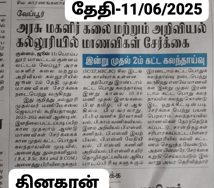 News இன்று முதல் இரண்டாம் கட்ட கலந்தாய்வு நடைபெறுகிறது Byadmin June 11, 2025June 11, 2025 வேப்பூர் அரசு மகளிர் கலை மற்றும் அறிவியல் கல்லூரியில் மாணவிகள் சேர்க்கை இன்று முதல் இரண்டாம் கட்ட கலந்தாய்வு நடைபெறுகிறது Share this news.....